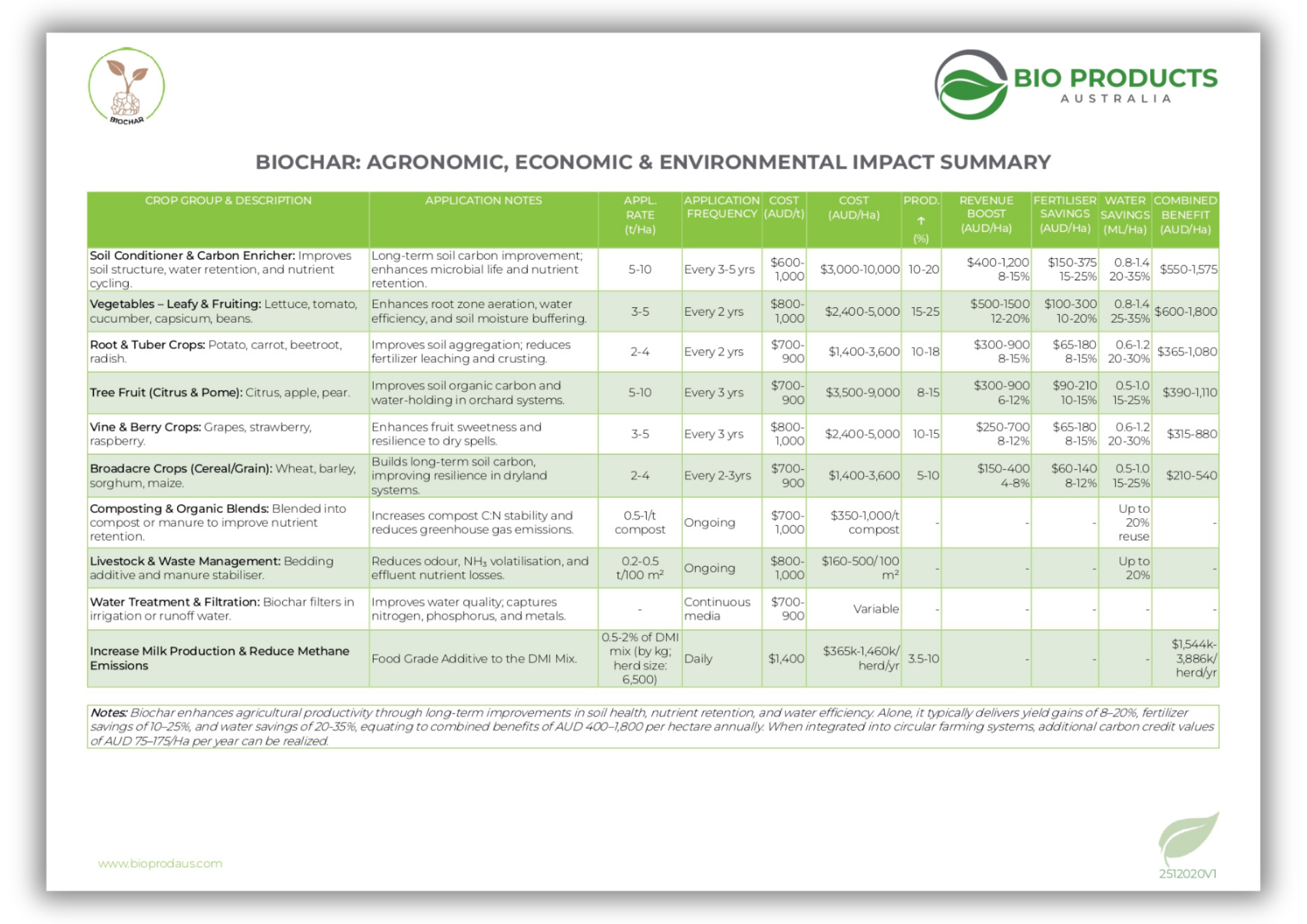 Bibliography: CSIRO (n.d.). Biochar as a Soil Amendment: A Review. Research and technical insights on biochar benefits and applications within Australia.