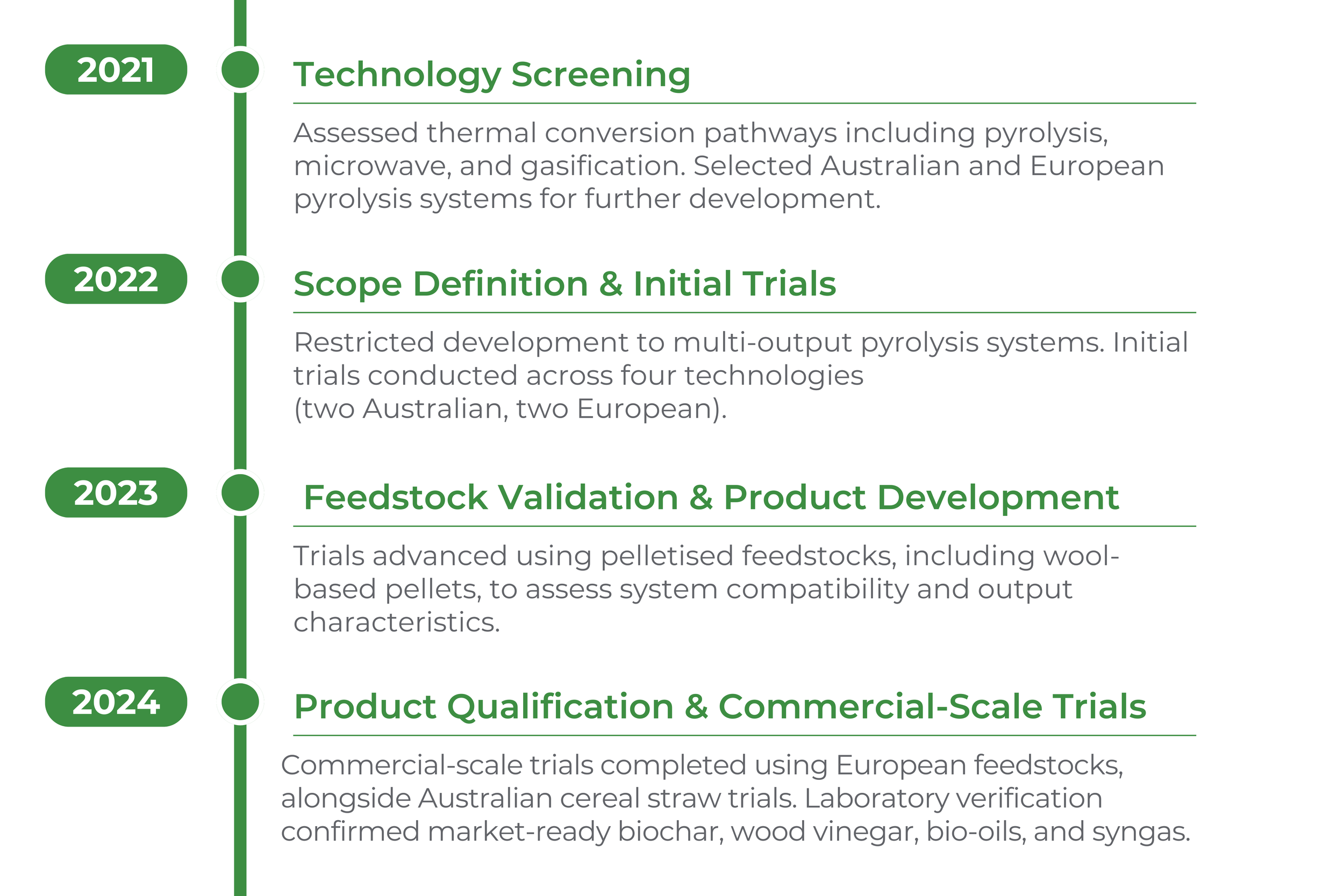 Bio Products Australia is committed to turning biomass and waste into value. Each milestone reflects our progress toward a carbon-neutral future through innovative solutions and impactful green investments.